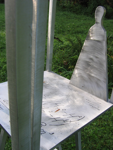 The installation ("Quantum Stream") is (was - I take them down for the winter as a group of sculptures were stolen a couple of years ago, and turned in for aluminum scrap at the local junk yard) a series of seven pieces running from just in back of the old New Jersey house, across the field (that KB originally cleared) and into the forest (had to cut a hole in the barberry). I call it "Quantum Stream" as it represents (be careful - here comes the art-speak) a beam of light made up of individual packets (Quanta). I'm fiddling with the conceit that each of the packets actually contains a different bit of information. Therefore each of the pieces contains some references to scientific theories -such as magnetism, transpiration/respiration, or the expansion rate of the universe.